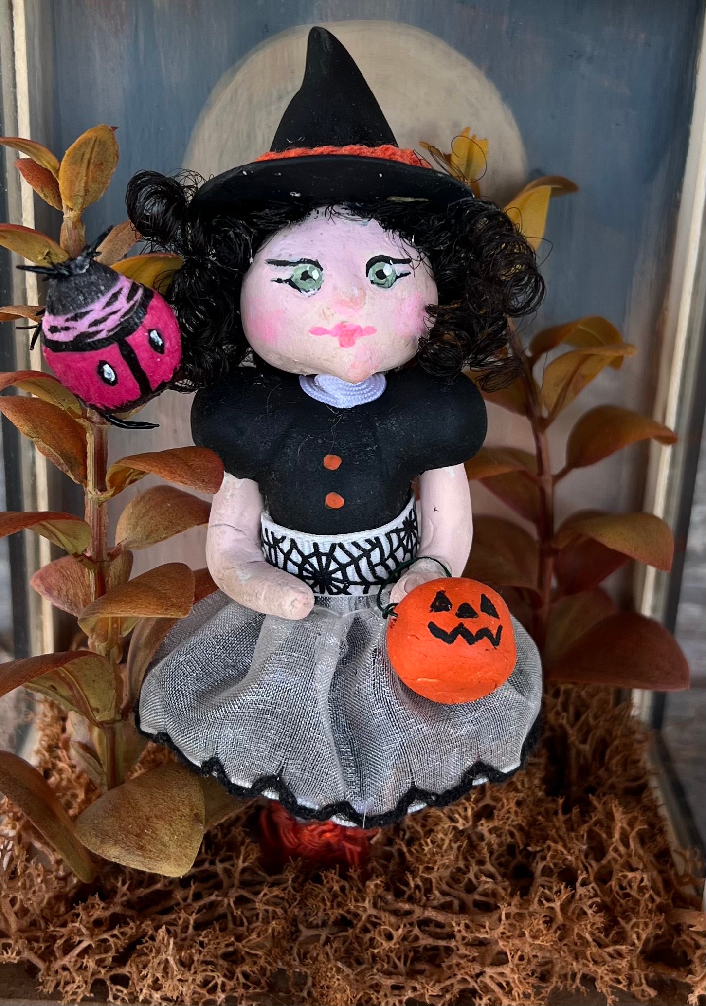 Available July 31. The first in a new series of paper play Trick or Treat scenes. Isabella is 5 inches tall, sitting in a wooden box with acrylic windows on three sides. The full moon glows gently behind her as she walks along, Jack o lantern in hand. A big red beetle bug is hanging onto the giant plant stalks that surround her. Crunchy fall ground cover under foot. Don't miss her orange fuzzy socks ;)